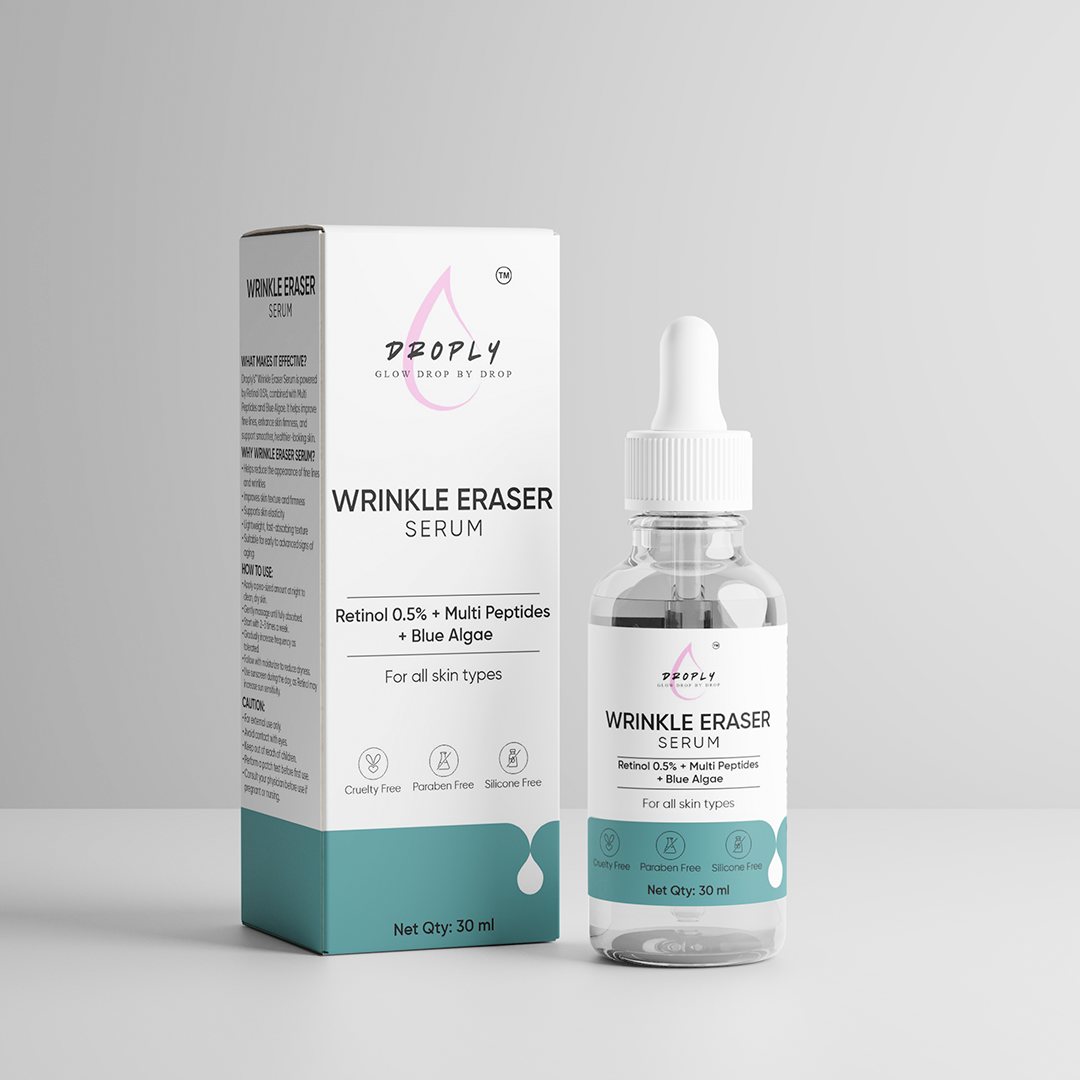 Droply’s™ Wrinkle Eraser Serum is powered by 0.5% Retinol with Multi Peptides and Blue Algae.